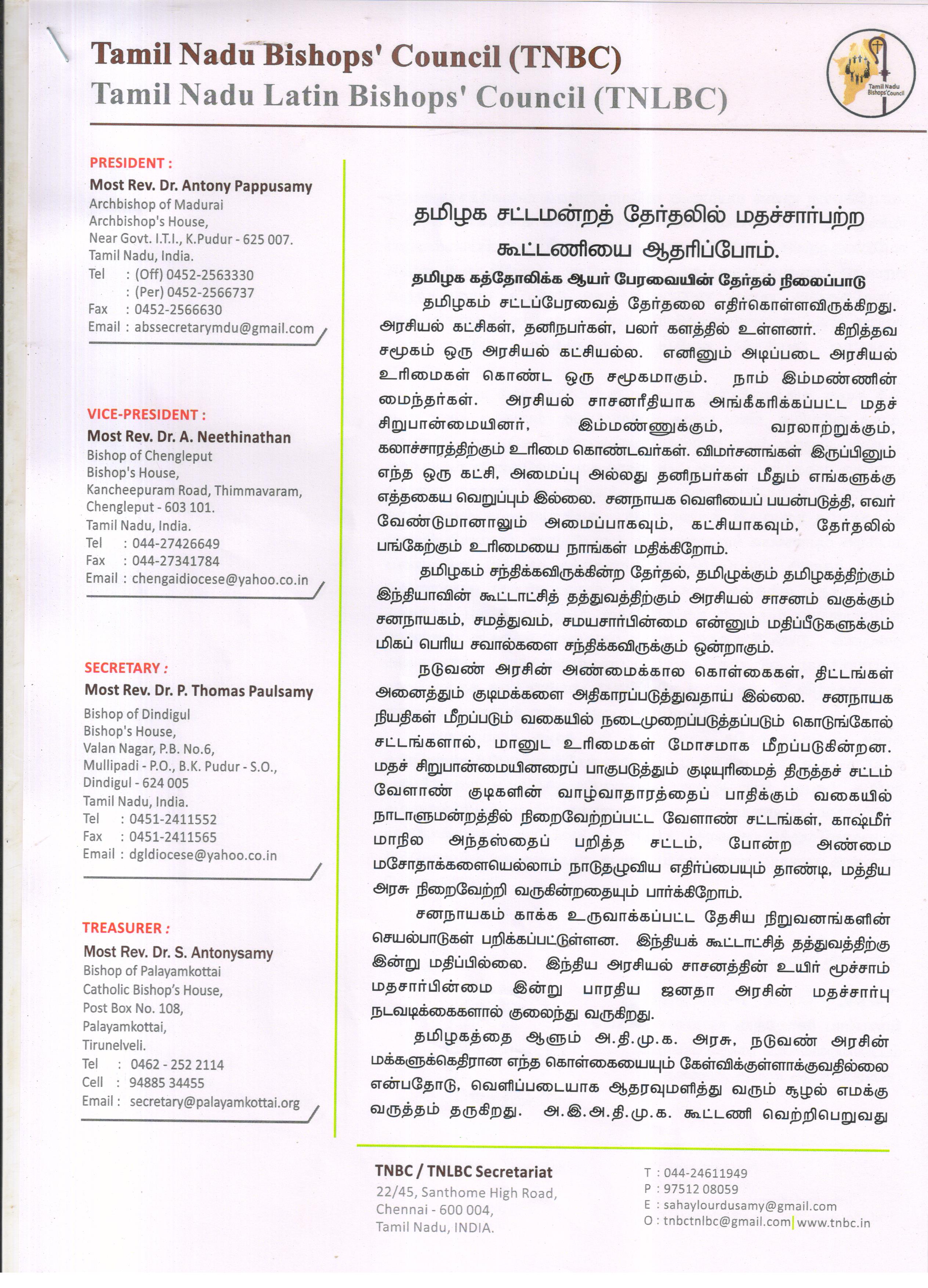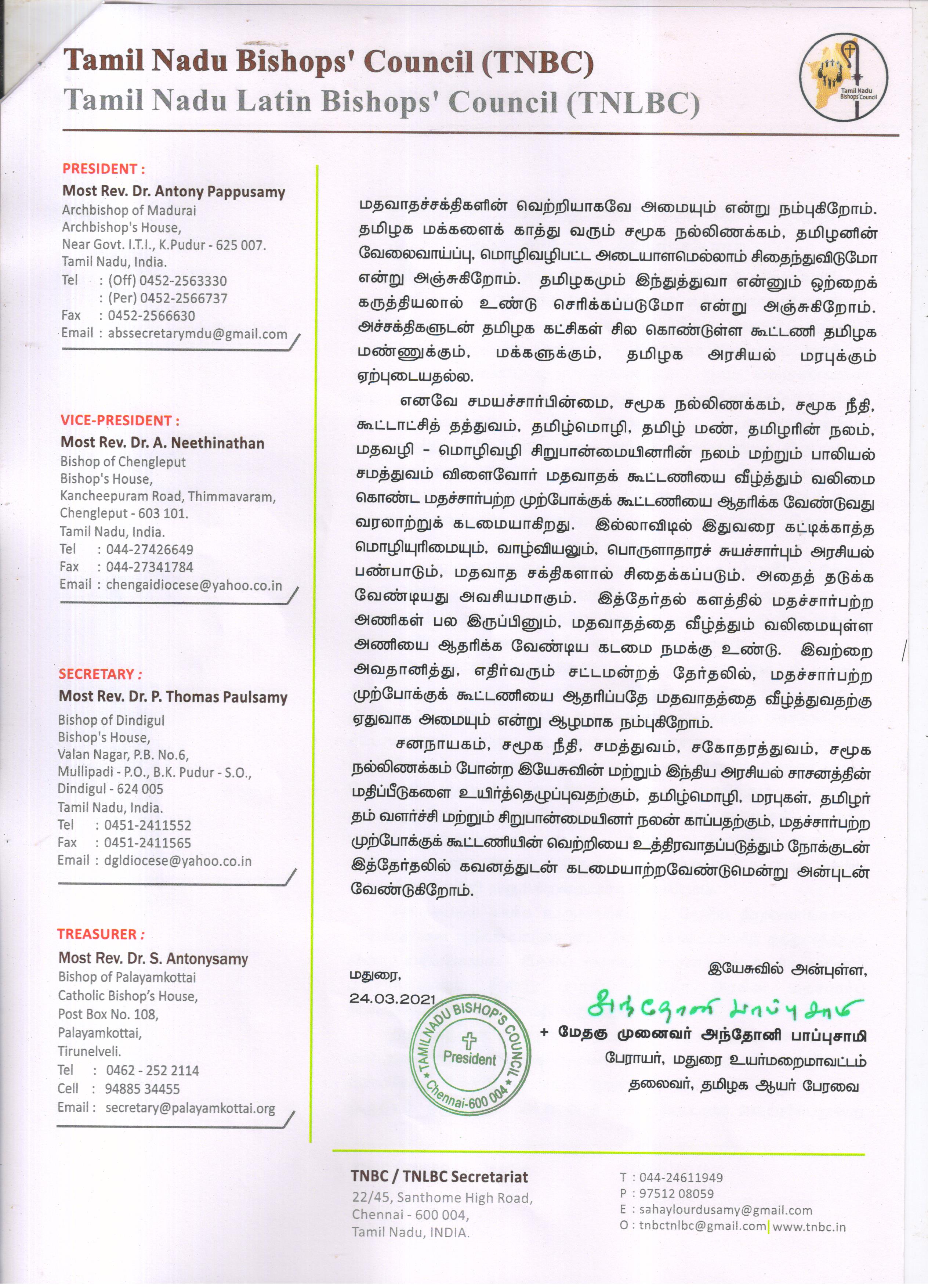 தமிழக ஆயர் பேரவையின் கிறிஸ்து பிறப்புச் செய்தி